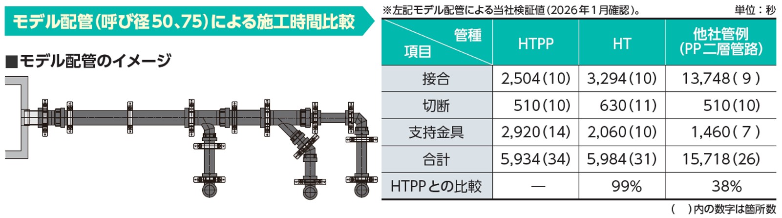 施工時間をHT管・継手(接着接合)と比較して同等以下、他社品と比較して