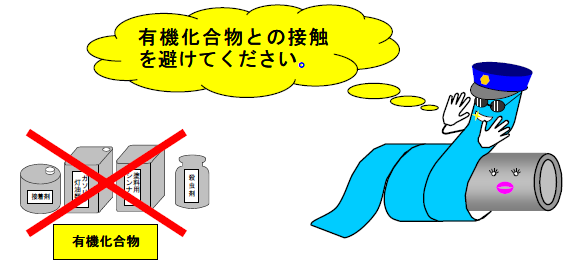 管・継手には、管・継手の材質に悪影響を及ぼす物質(例えば、アセトン・シンナー・クレオソート・殺虫剤・白あり駆除剤など)の吹付け、塗布、接触などを行ってはならない。
