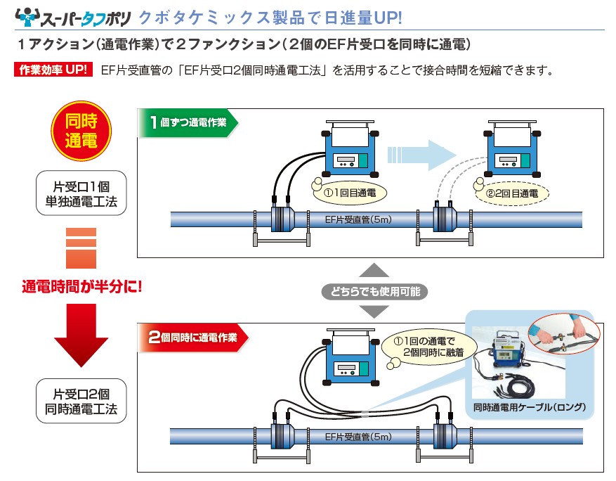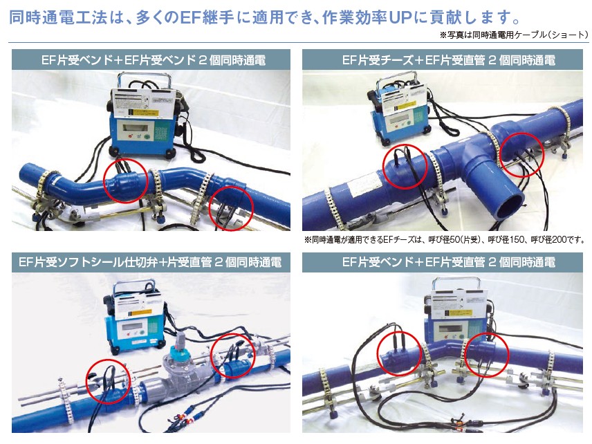 同じ呼び径のEF片受口を1度の通電で2個同時に通電する工法です。これにより、総通電時間を約1/2に短縮することが可能です。施工には同時通電ケーブルが必要になります。同時通電が可能な製品、施工方法および注意点などは、カタログをご参照ください。